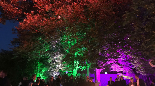 Wir setzen hierbei auf moderne LED Technik. Teilweise werden auch Akkustrahler genutzt, um ohne das Verlegen von Kabeln flexibel ausleuchten zu können. Du hast eine Location, mit einem schönen Außenbereich, mit Bäumen, herausragender Architektur, Säulen? Hier können wir leistungsstarke LED Fluter einsetzen.